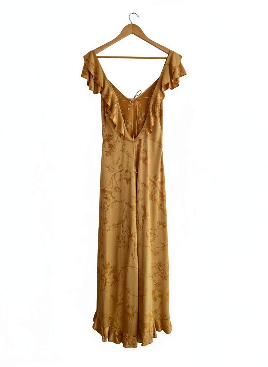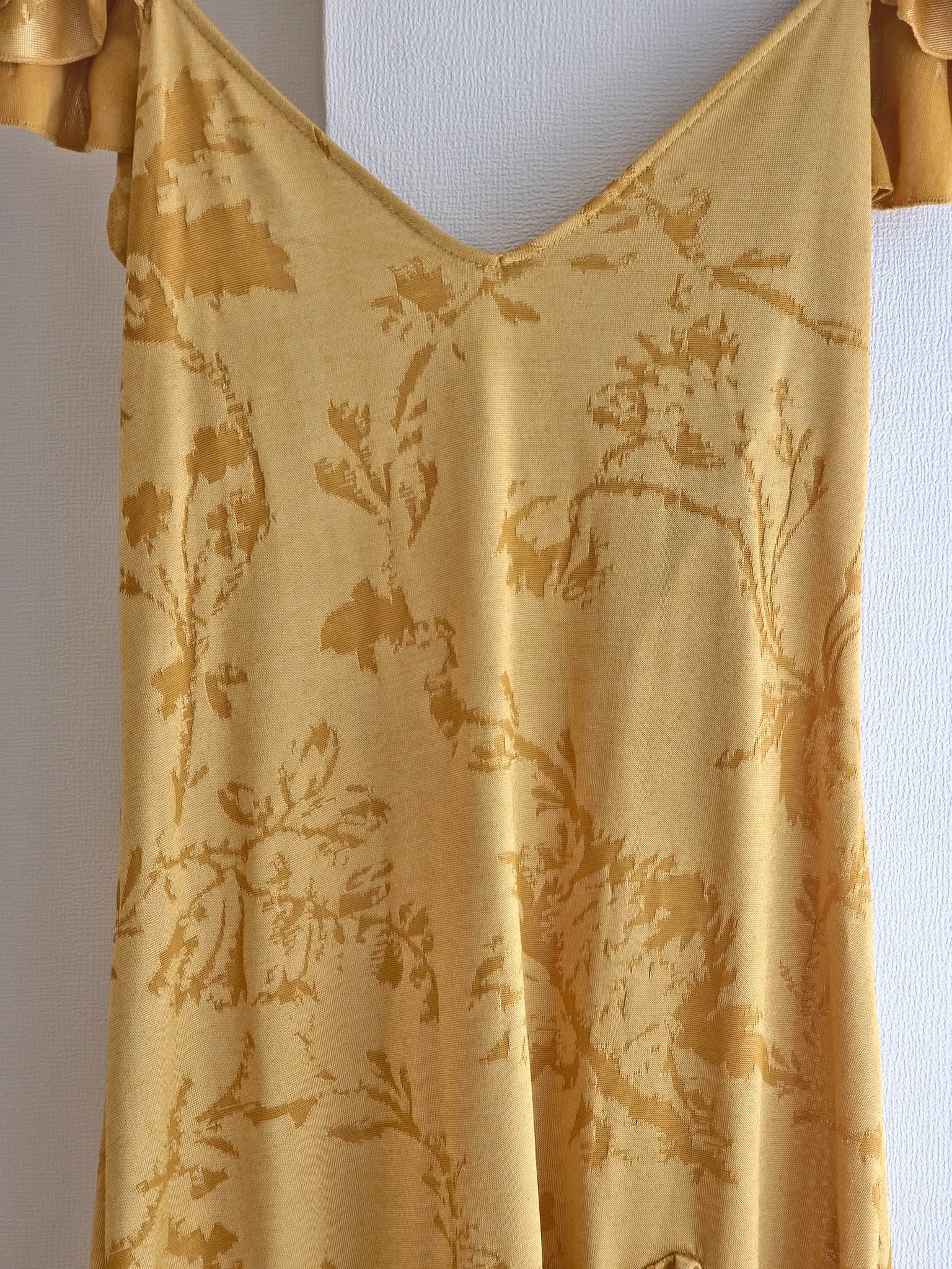 Vestido largo estilo gitano en tela amarilla diseño flores, con escote en V, espalda escotada en V y tiene una abertura adelante que le da movimiento al vestido.