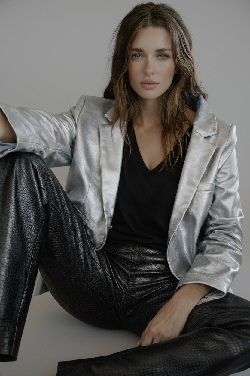 Pantalón ancho de cuerina elasticada color gris oscuro con textura. Pretina ancha de 8 cm a la cintura (tiro alto).