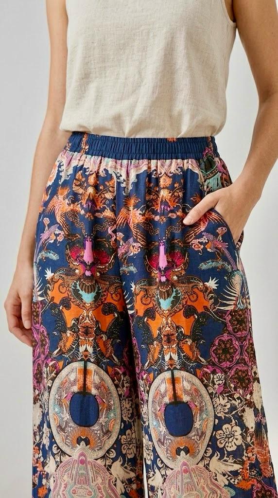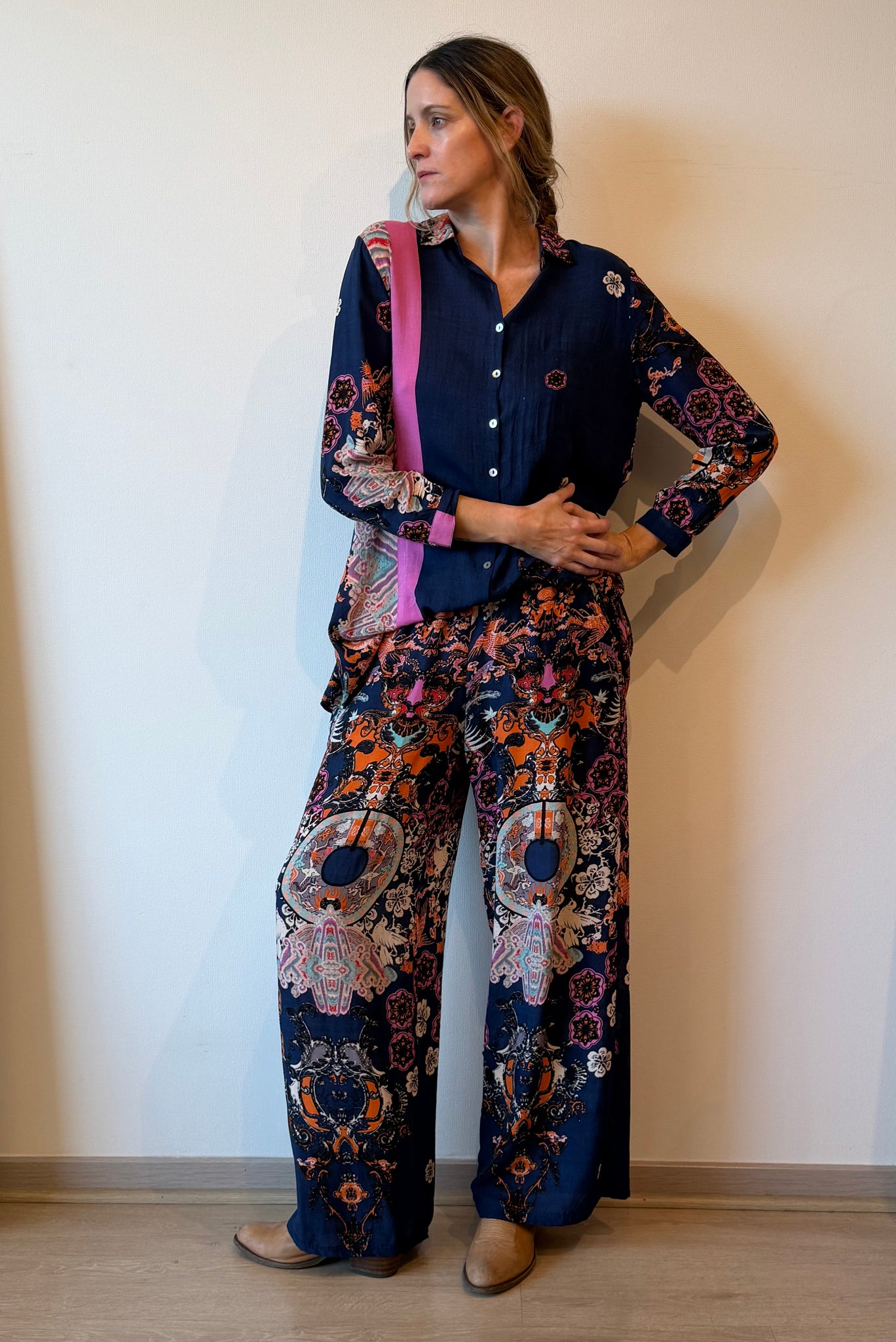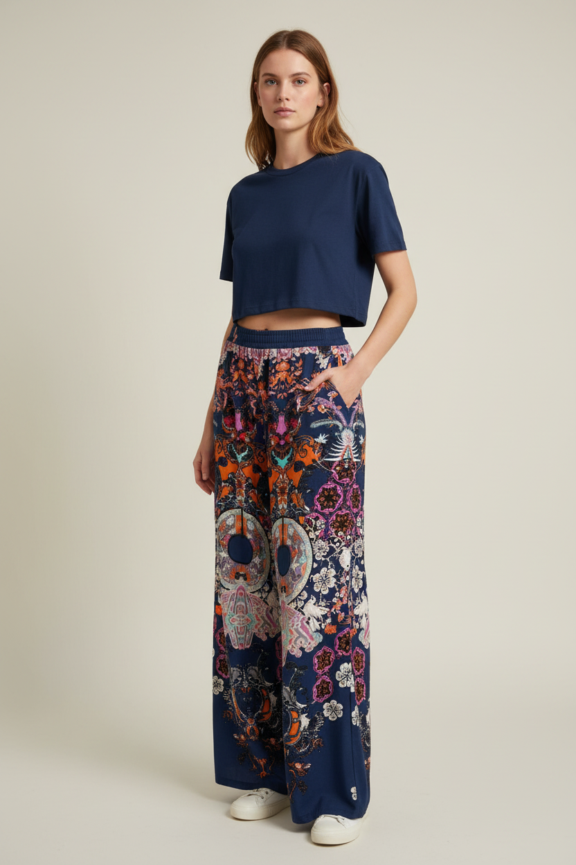 Pantalón palazzo largo de algodón color azul marino estampado con bolsillos. Su calce es suelto y fluido, ideal para looks cómodos.
