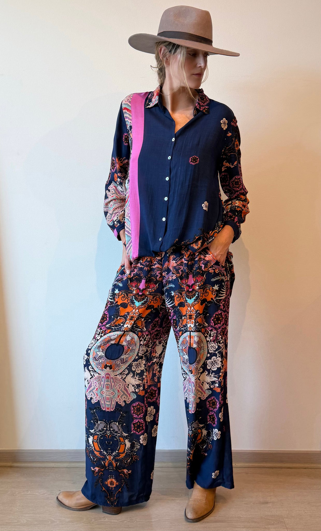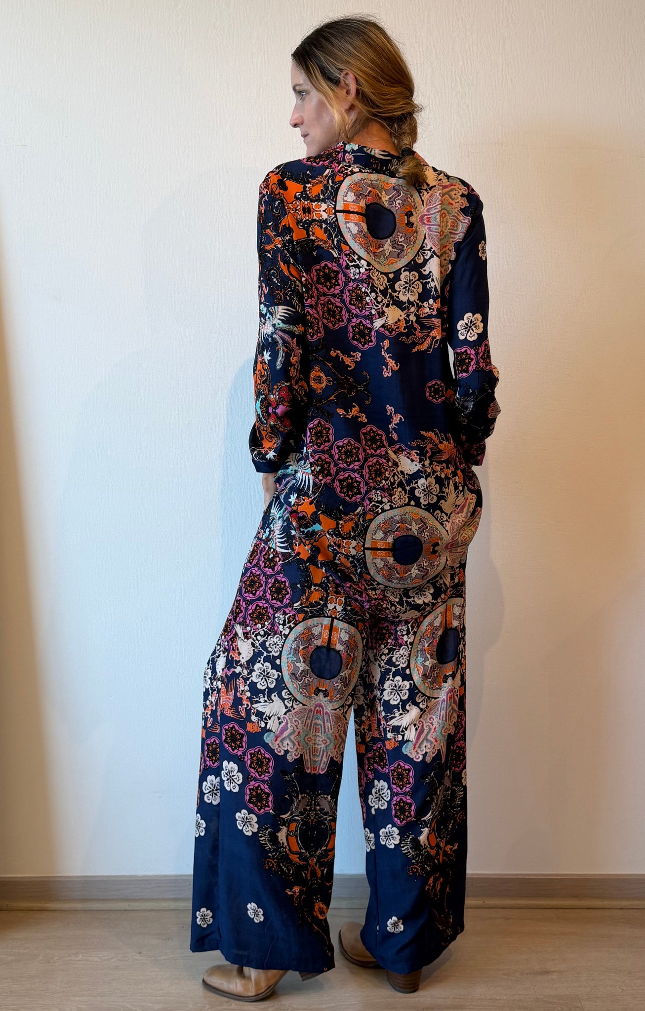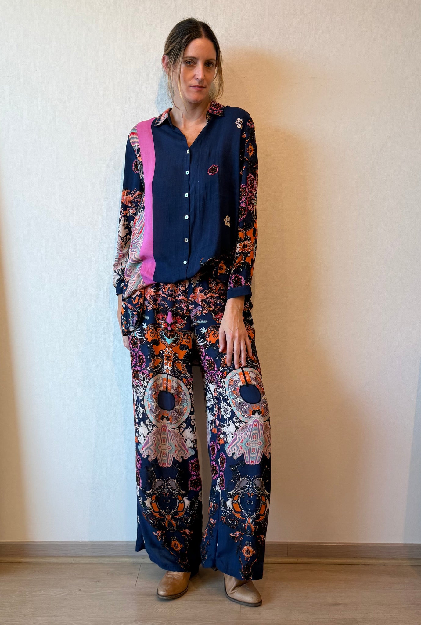 Pantalón palazzo largo de algodón color azul marino estampado con bolsillos. Su calce es suelto y fluido, ideal para looks cómodos.