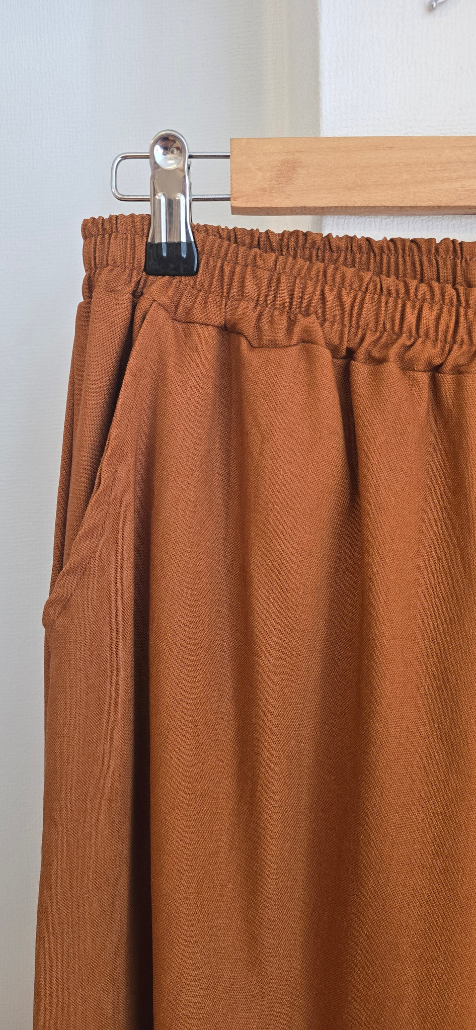 Pantalón ancho de lino en color camel; tiene una base camel profunda con matices tierra y un leve subtono arcilloso. Es más cálido que un camel clásico y menos anaranjado que un terracota. Tiene bolsillos y es con pretina elasticada.