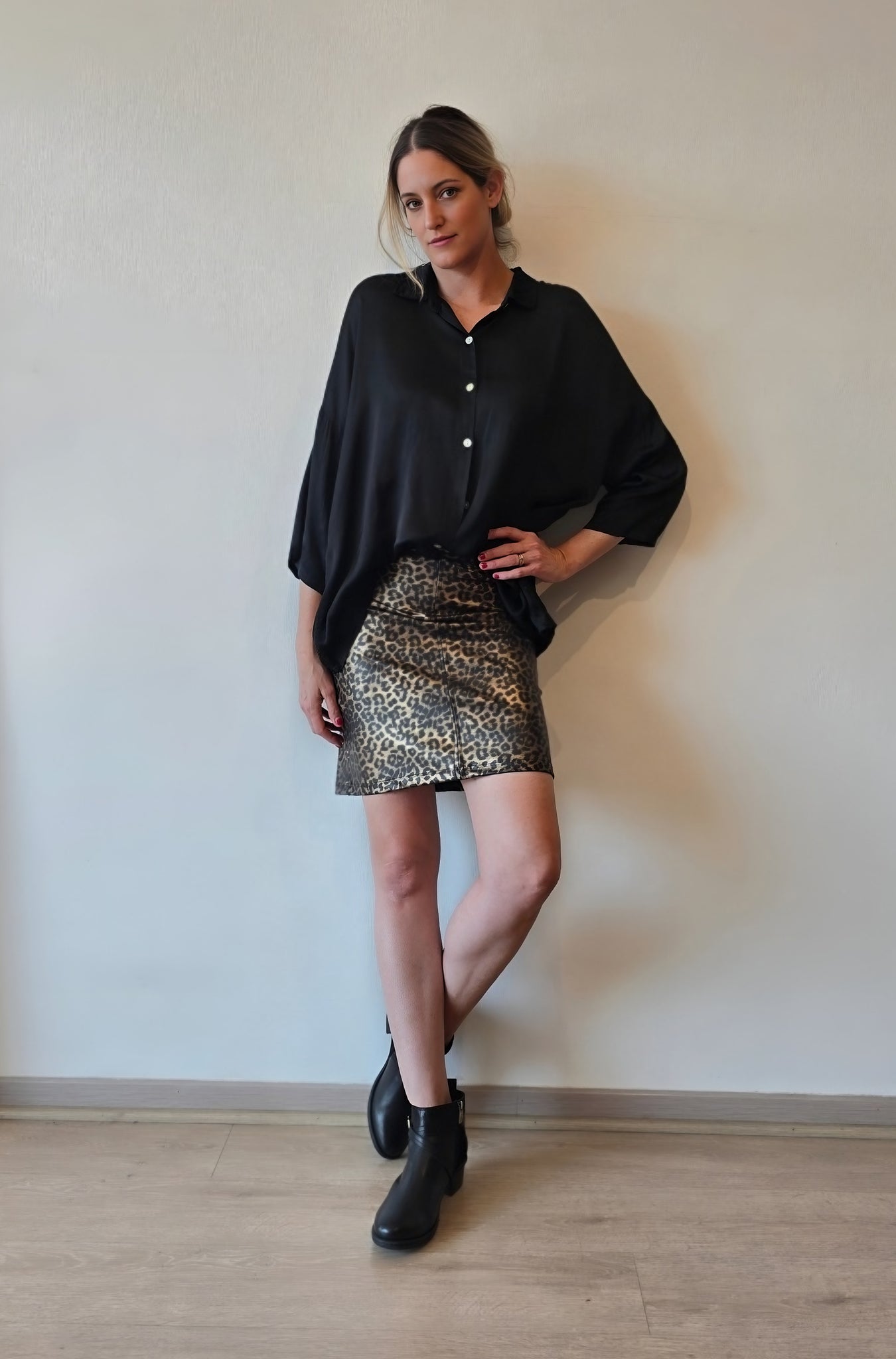 Falda largo 3/4 de cuerina elasticada animal print con pretina ancha y a la cadera.