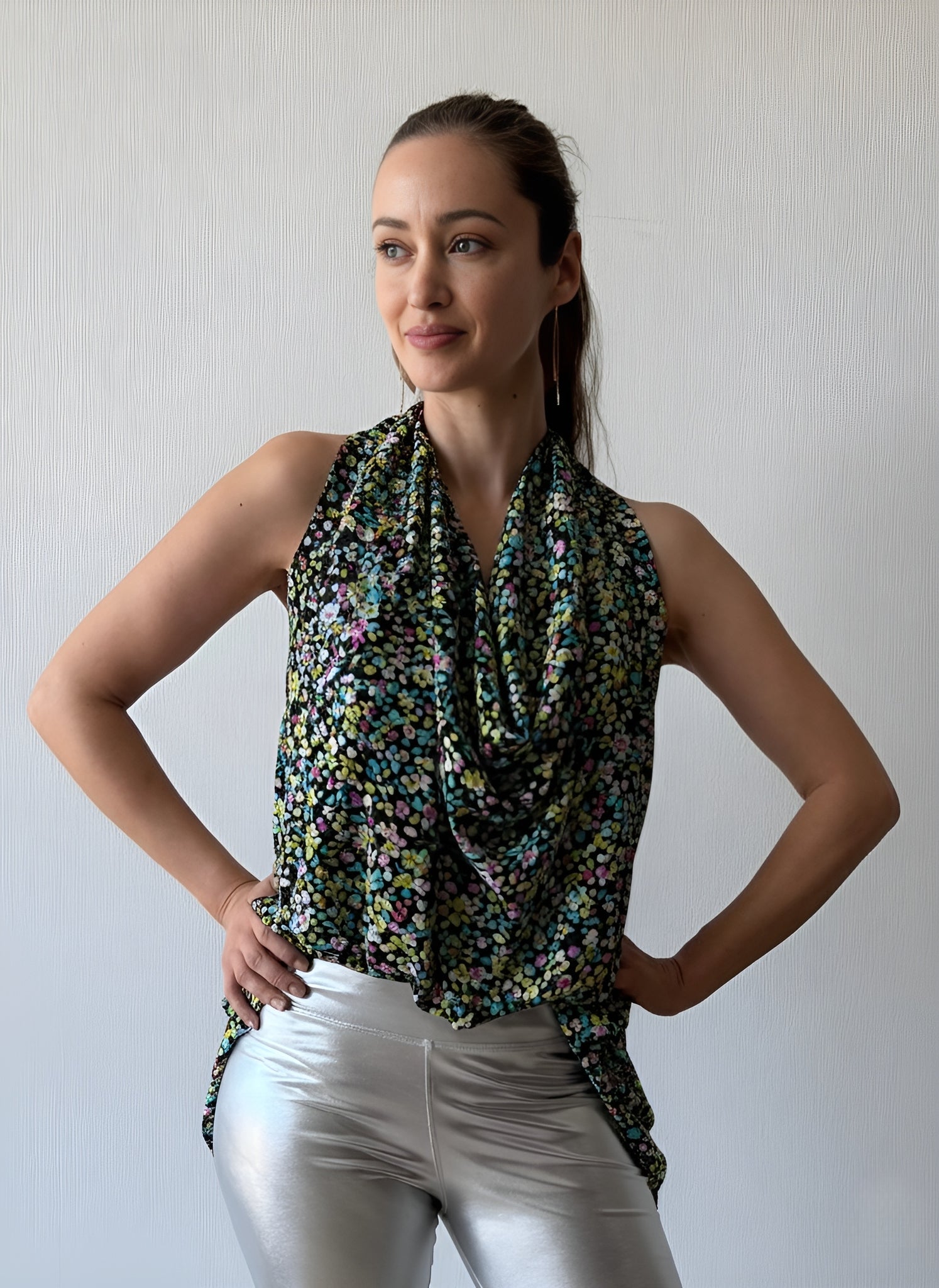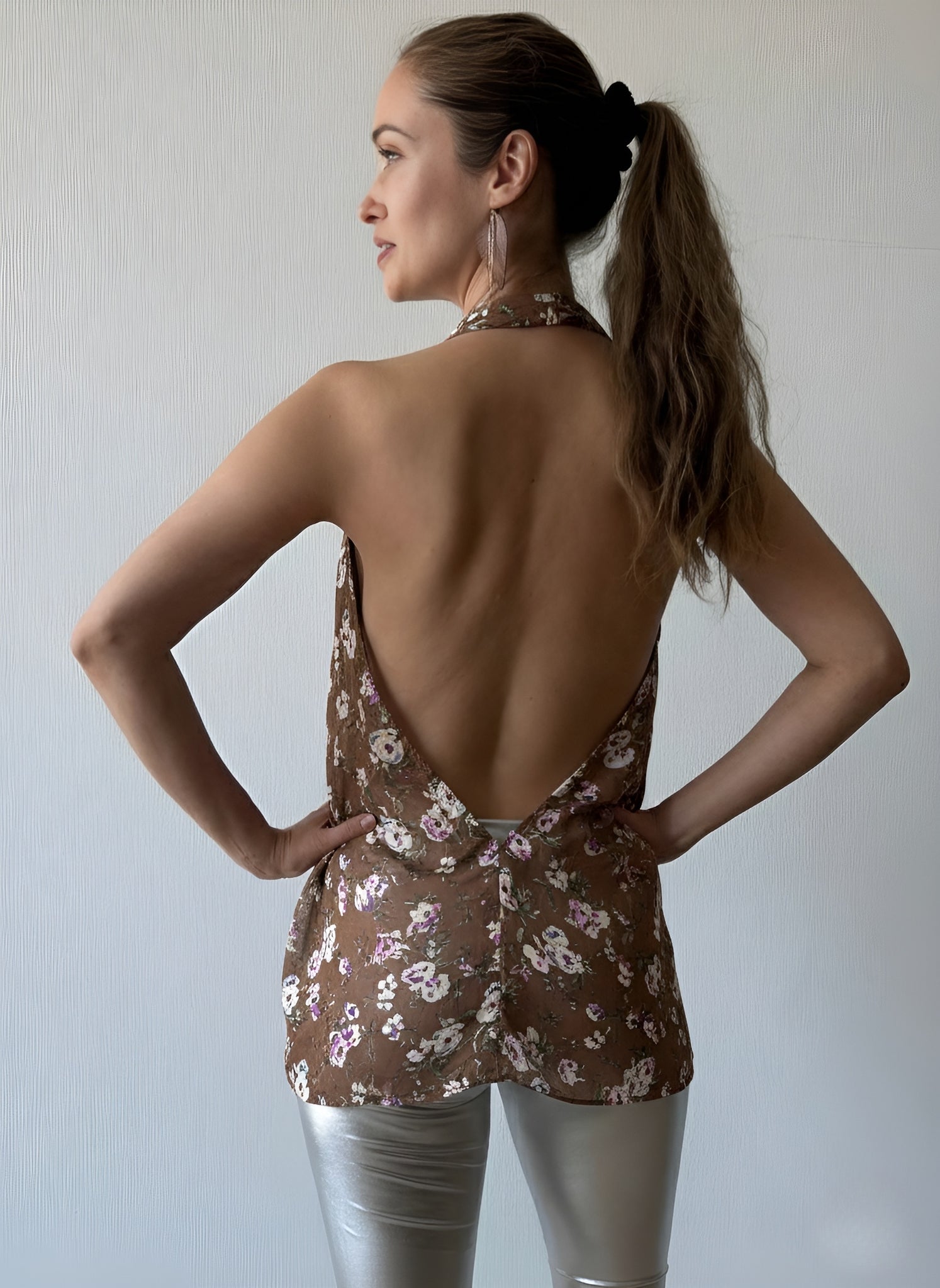 Blusa gasa amarrada al cuello con espalda descubierta. Talla única. Trae un lazo de la misma tela.