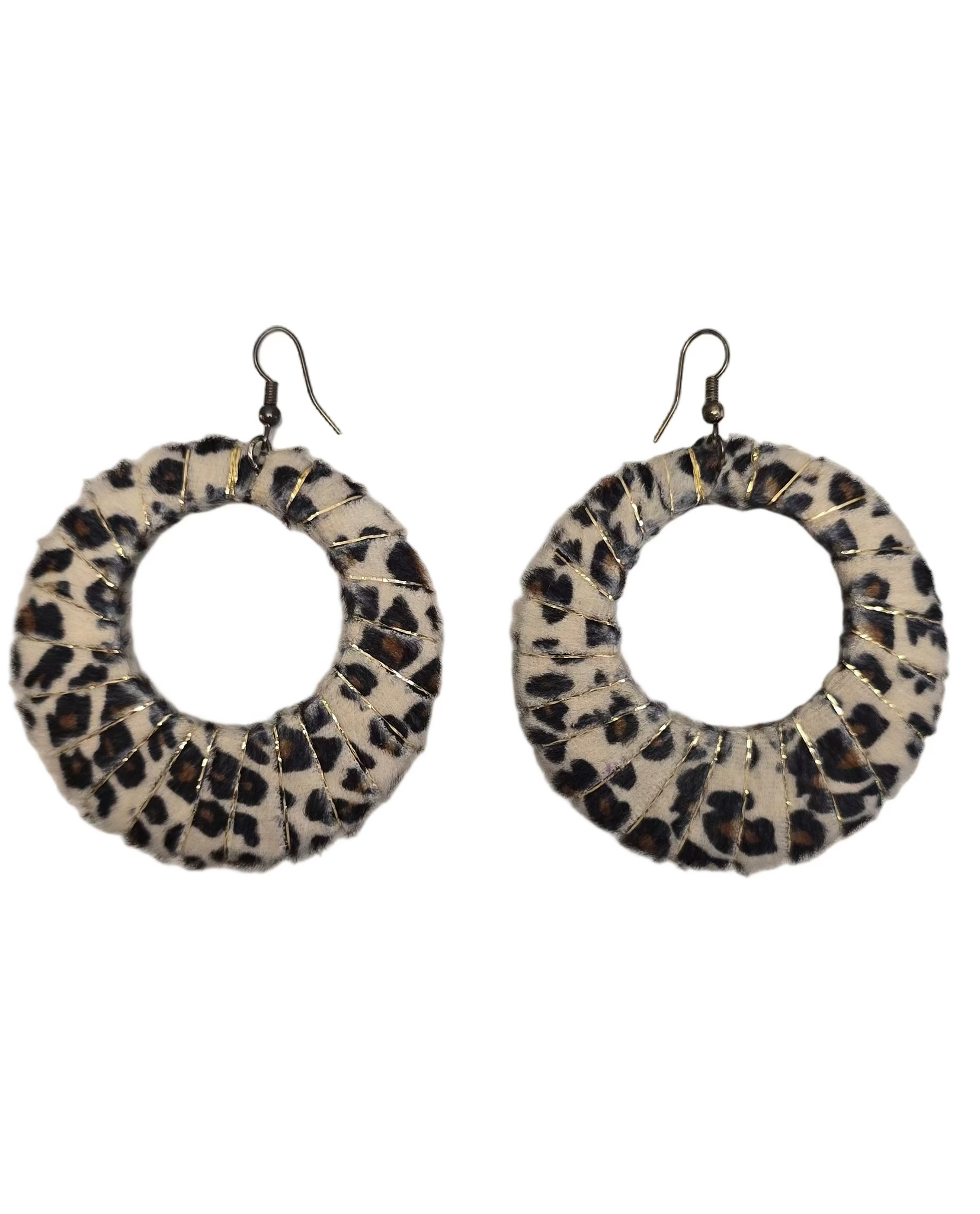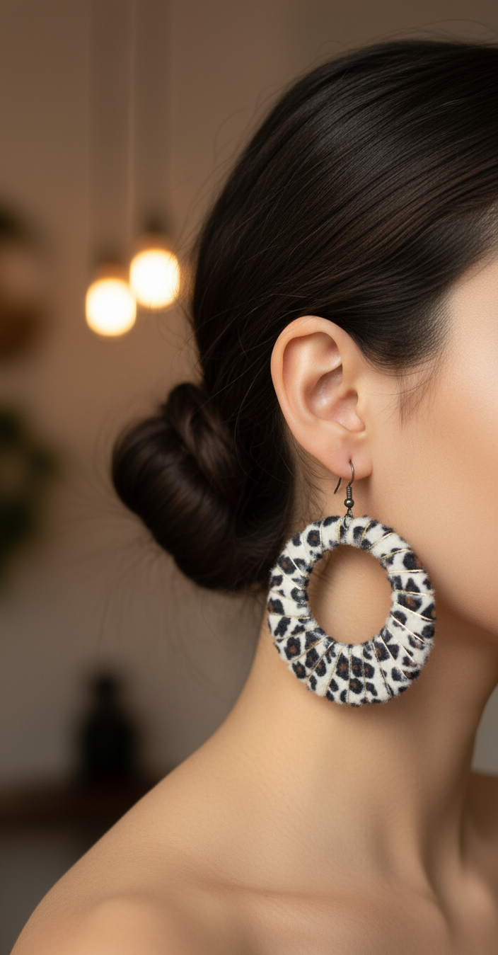 Aros redondos con estampado de animal print blanco y detalles dorados lo hacen un accesorio audaz y sofisticado, perfecto para realzar cualquier tenida.