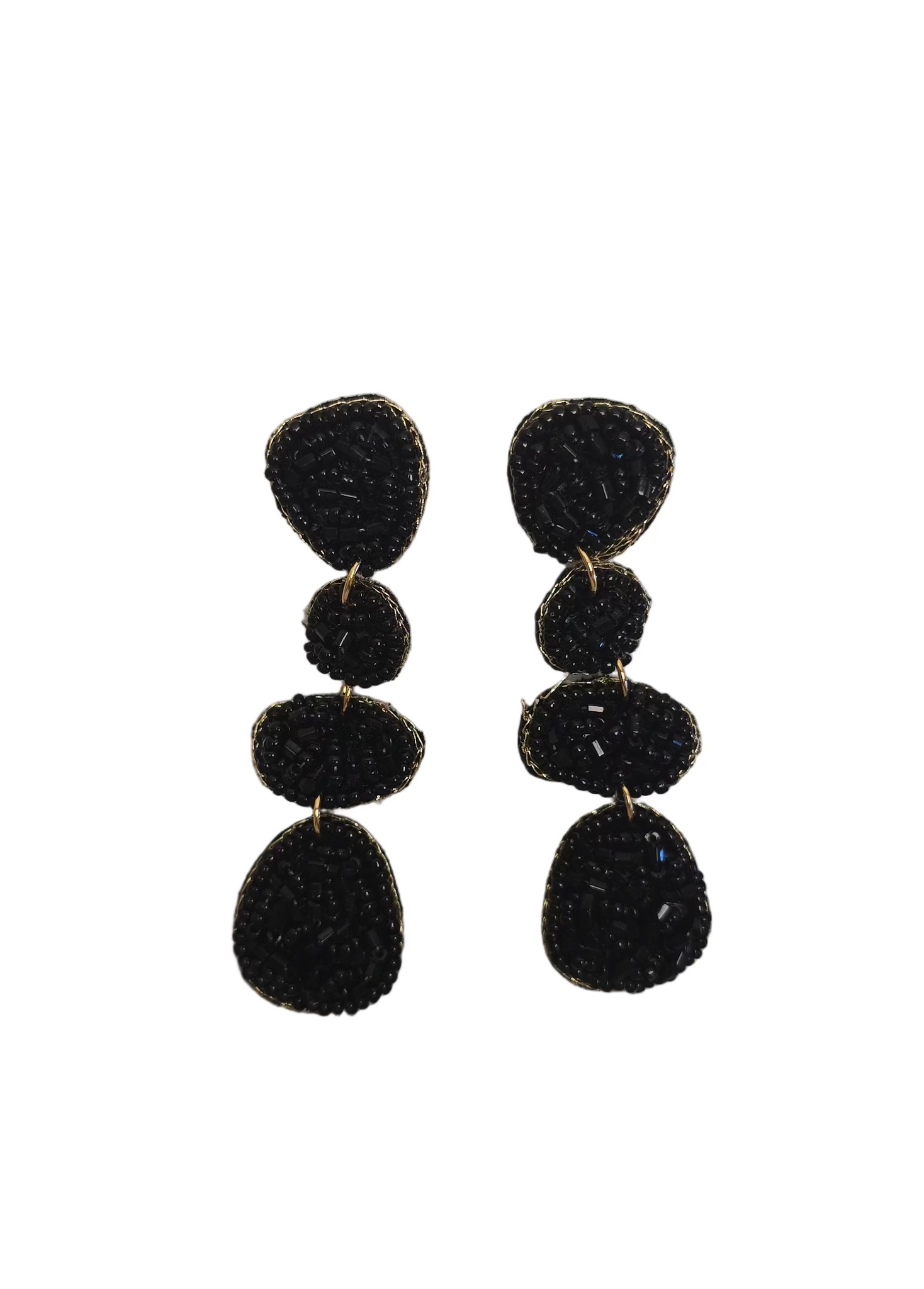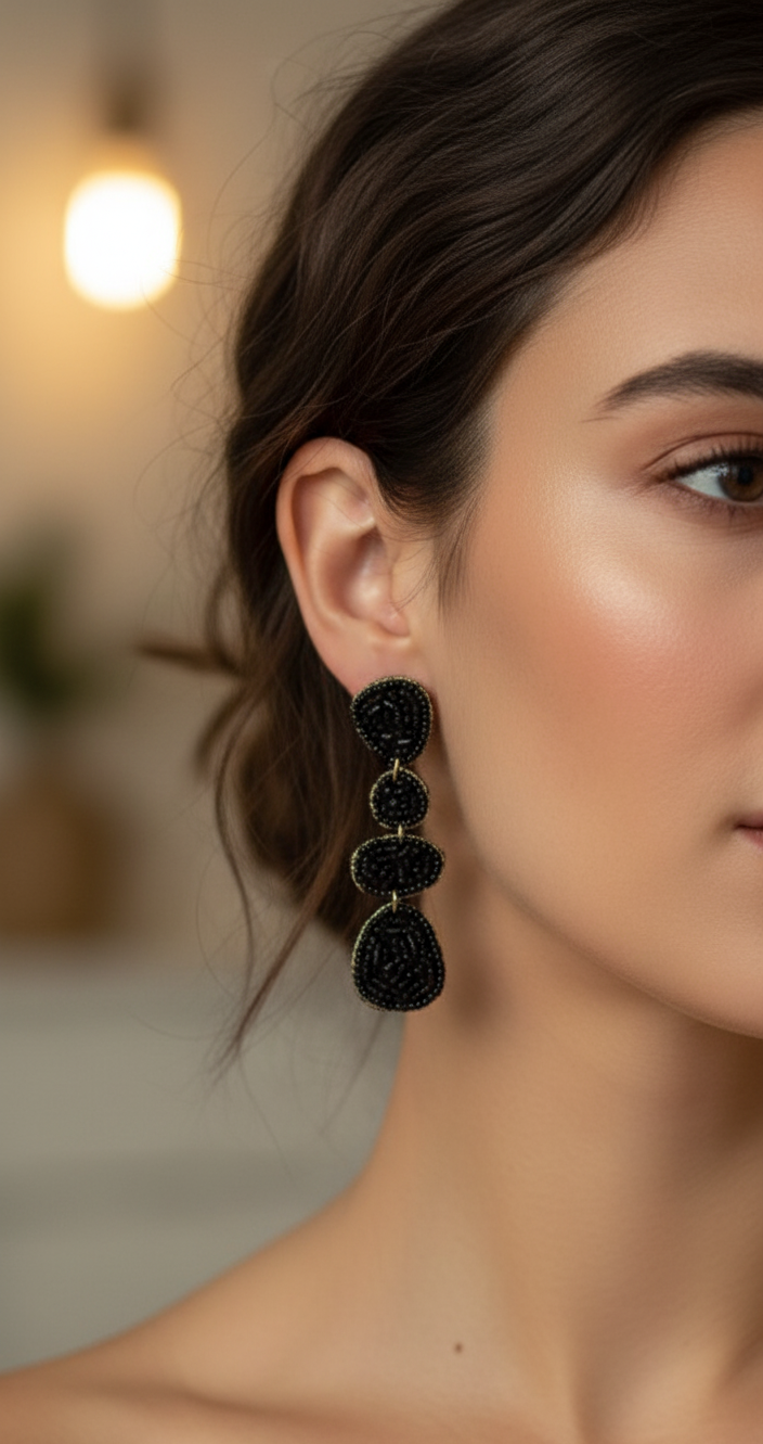 Aros colgantes artesanales de mostacillas negras, con un diseño escalonado que crea un efecto de cascada, perfectos para un estilo bohemio y elegante.
