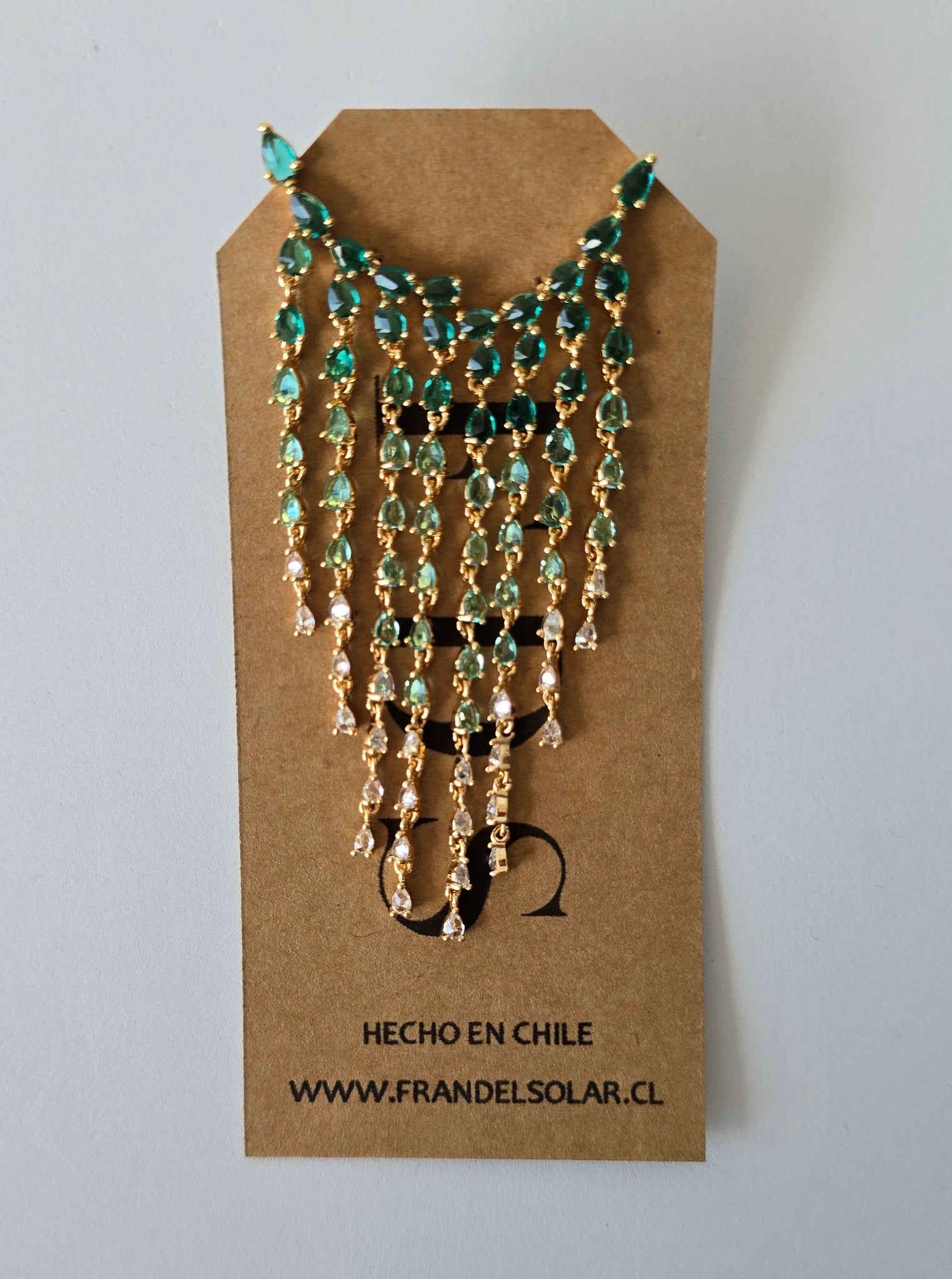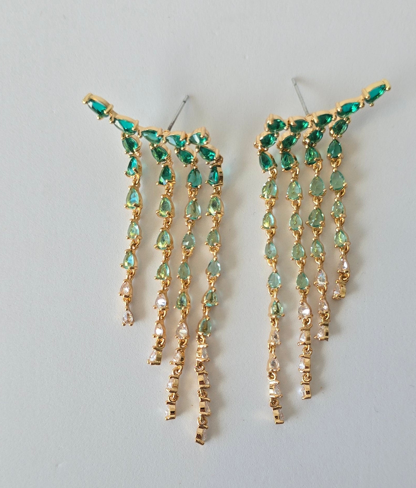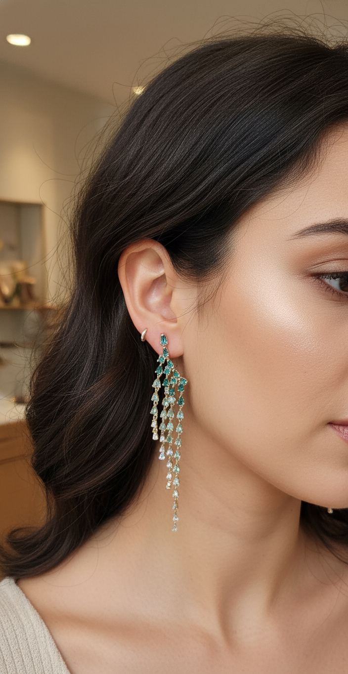 Aros elegantes y colgantes con múltiples hebras de pequeñas gemas que degradan en tonos de azul verdoso, simulando una cascada brillante.