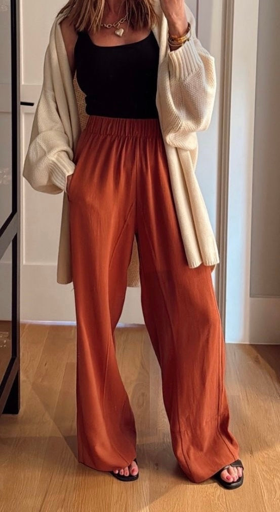 Pantalón ancho de lino en color naranjo. Tiene bolsillos y es con pretina elasticada.