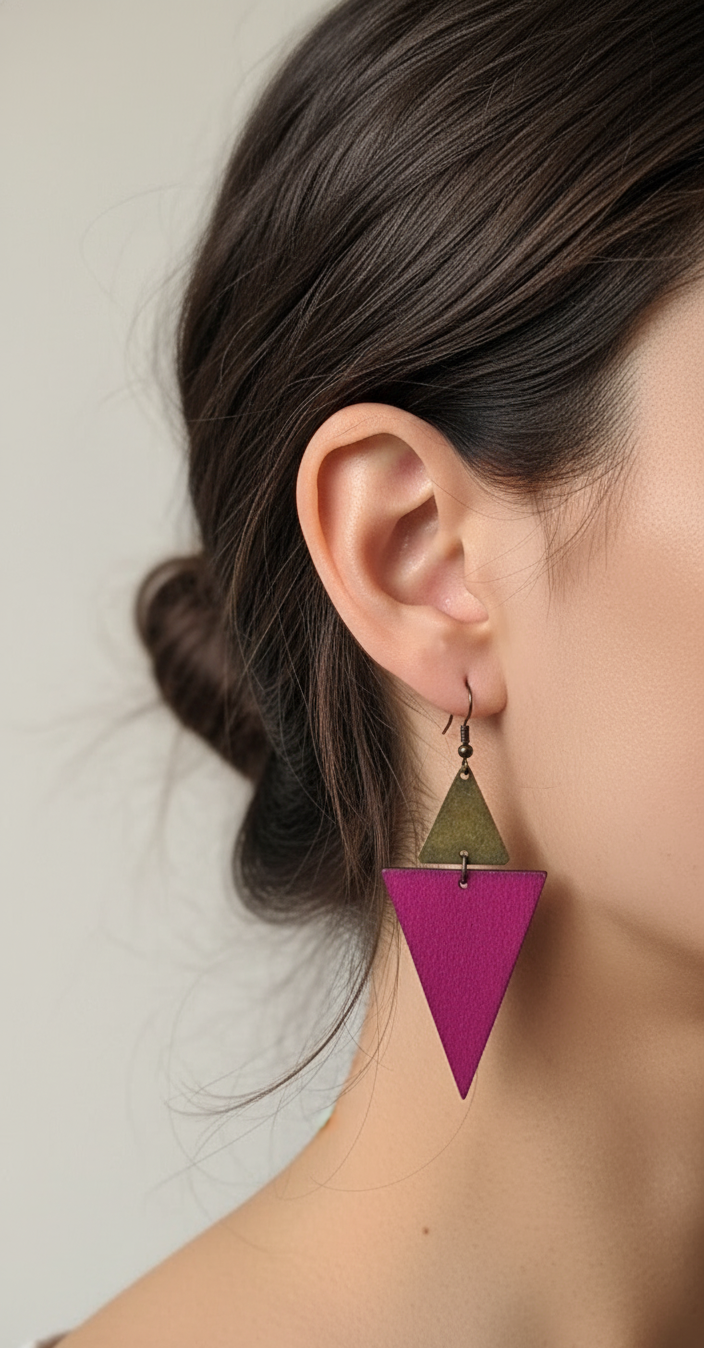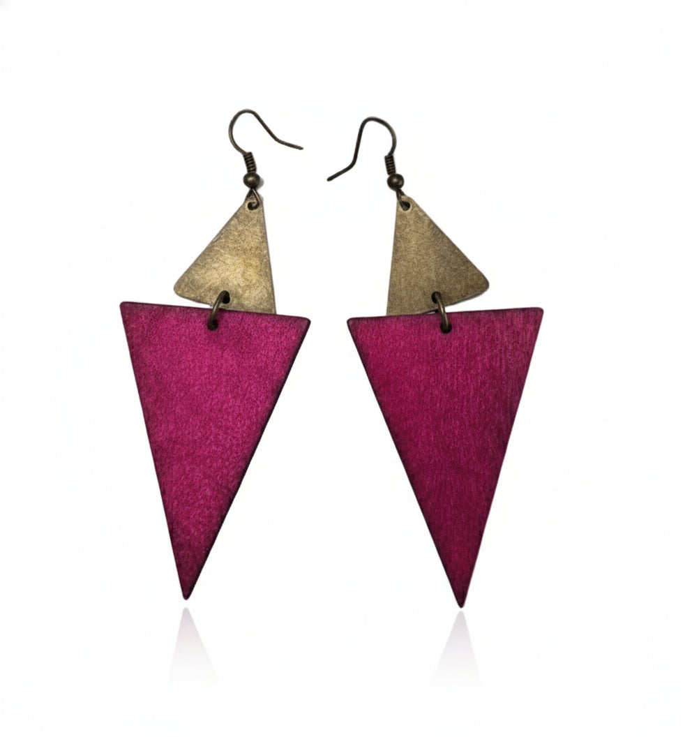 Aros geométricos con un diseño de doble triángulo. El superior es de metal bronce o dorado antiguo, y el inferior es un triángulo de madera en un vibrante color fucsia, creando un contraste moderno y elegante.
