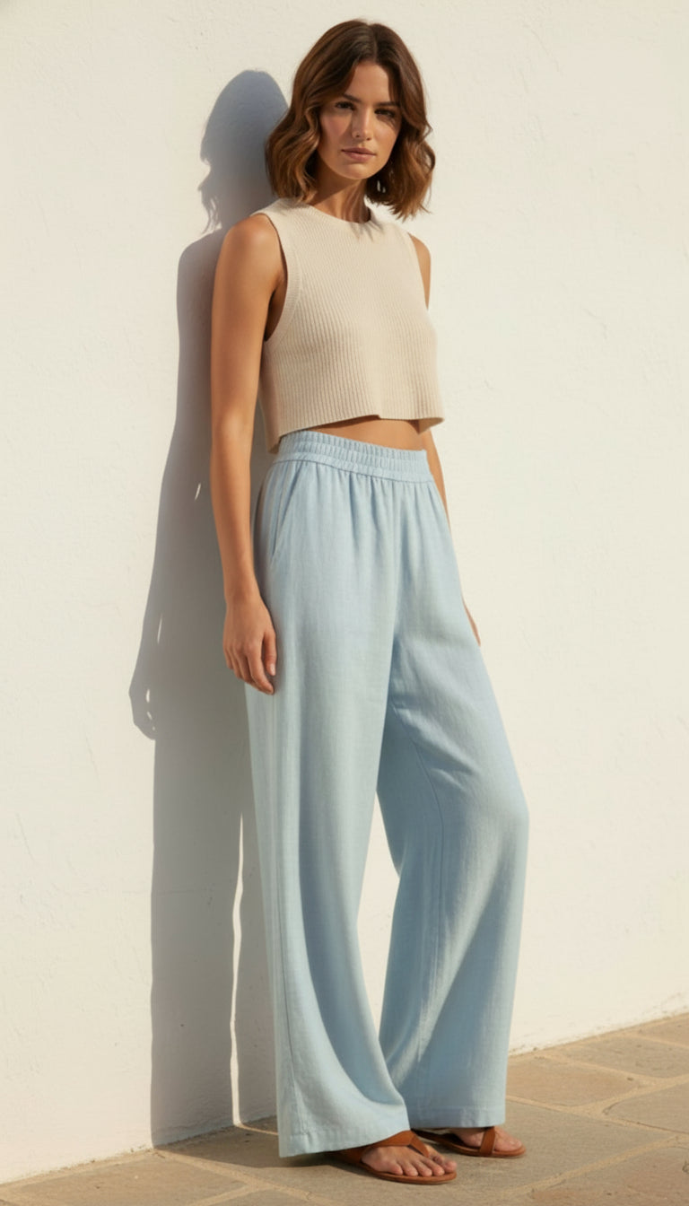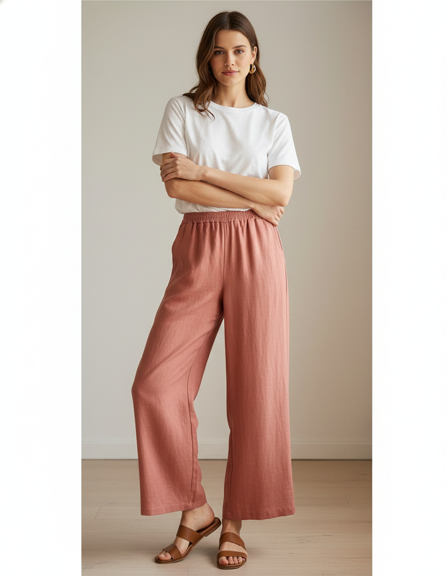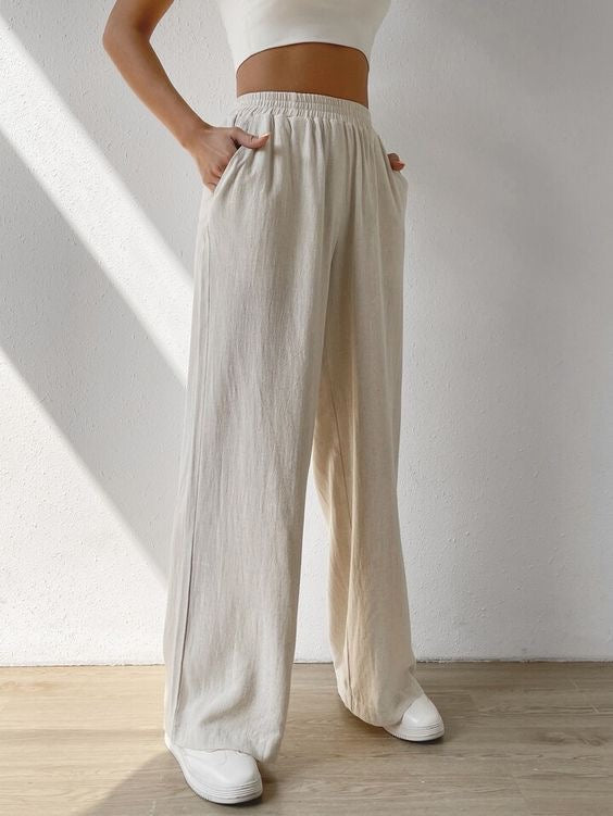 Pantalón ancho de lino en varios colores. Tiene bolsillos y es con pretina elasticada.