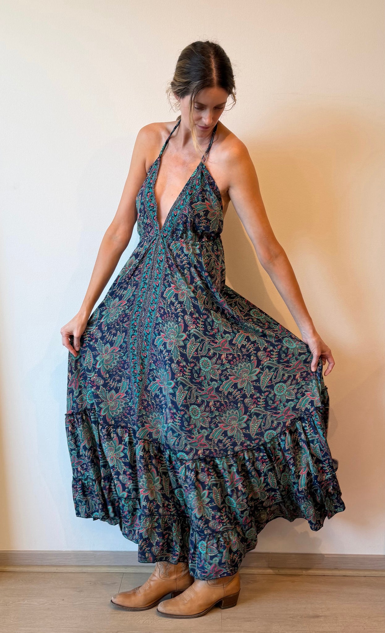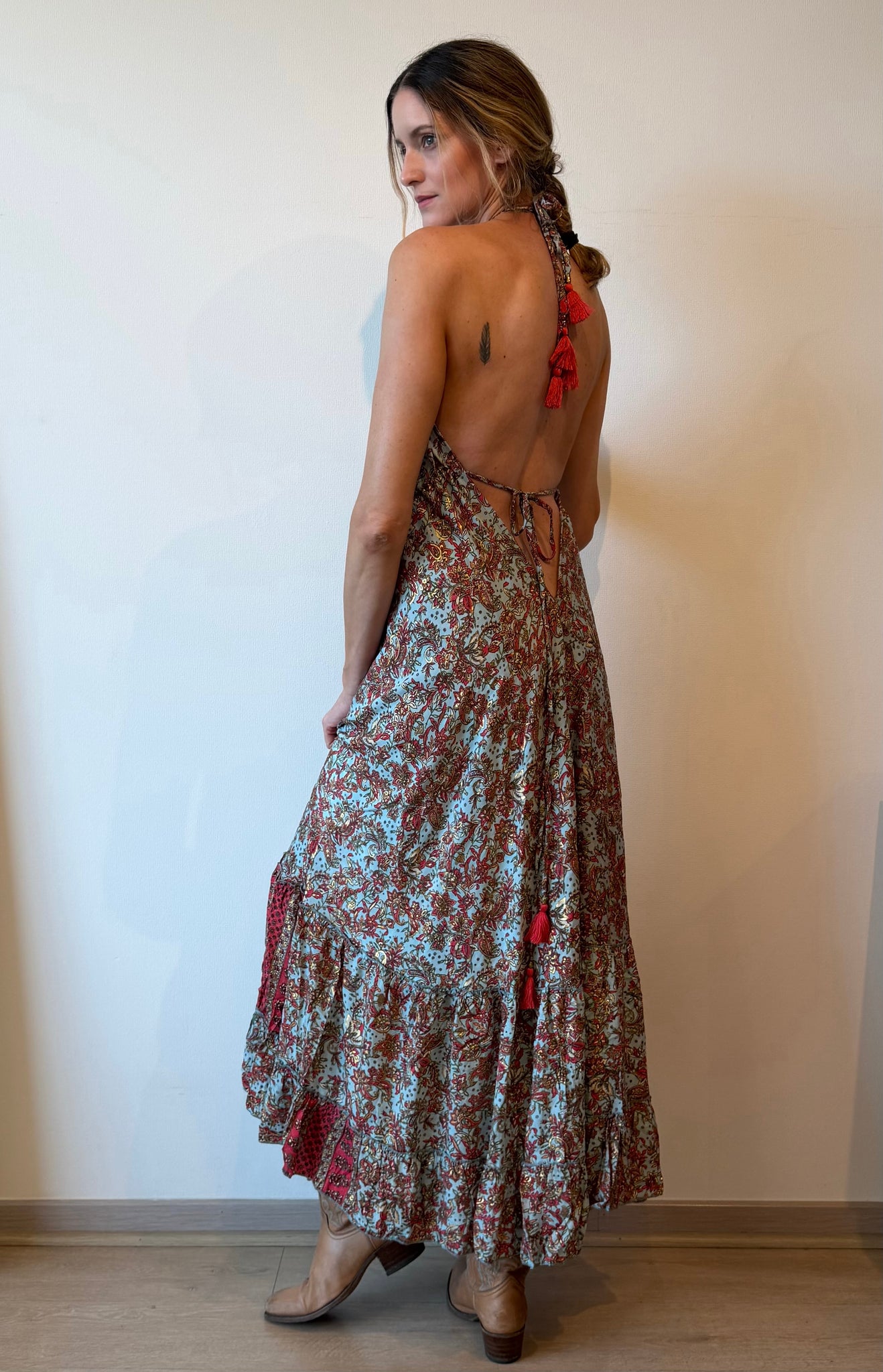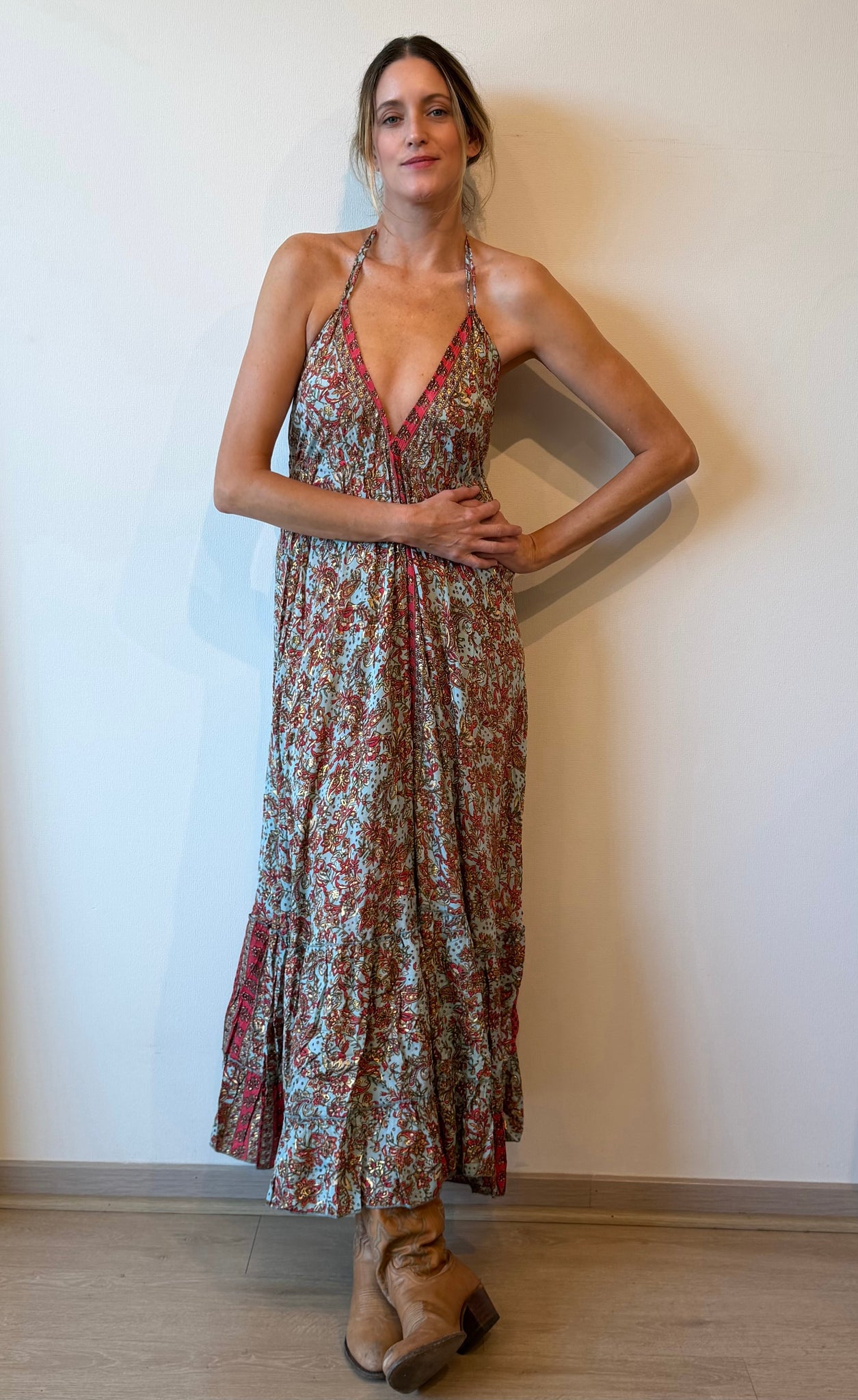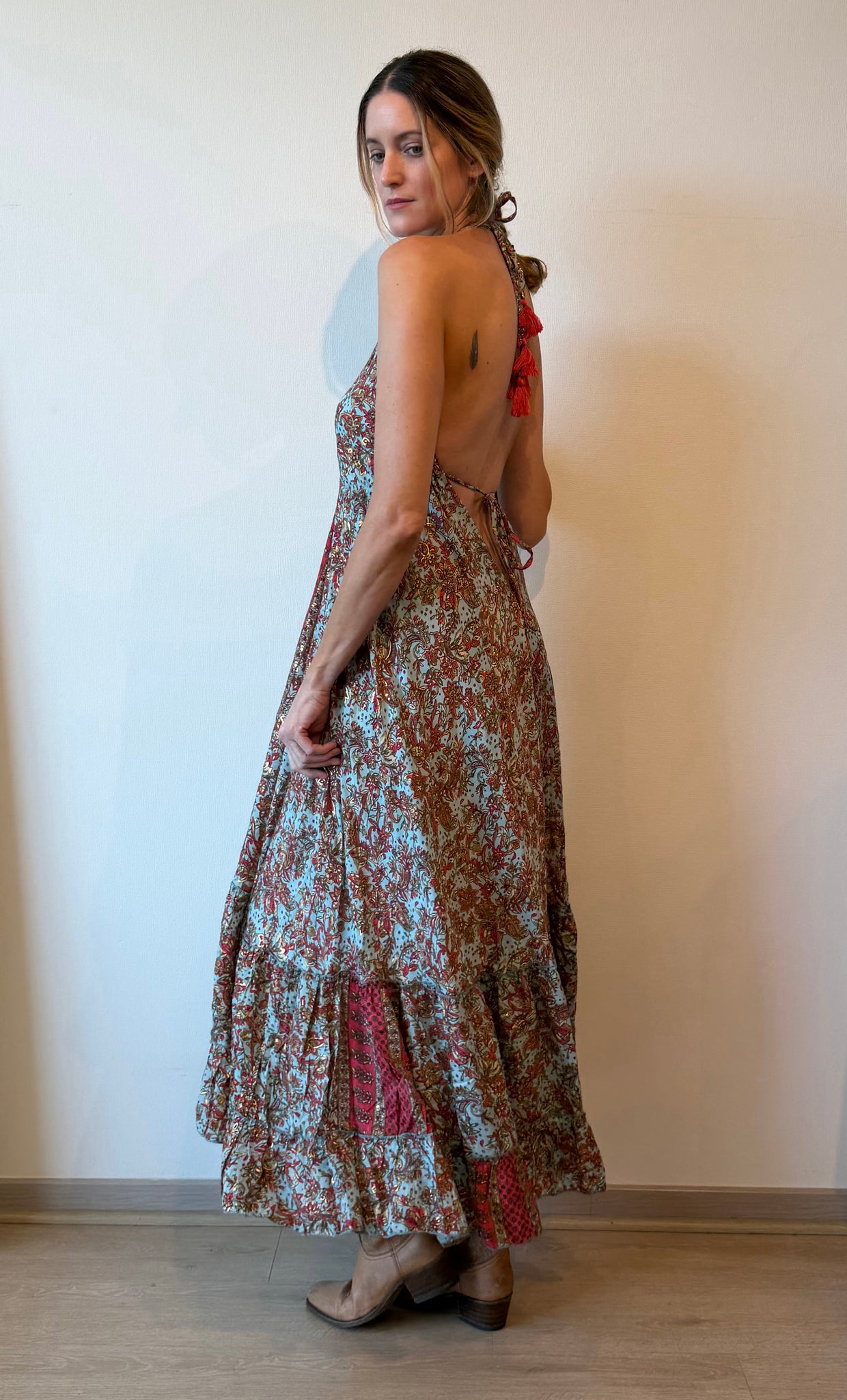 Vestido largo de seda estampado. Se amarra al cuello, tiene la espalda descubierta y se ajusta con los tirantes. Tiene muy lindo ruedo. Talla única.