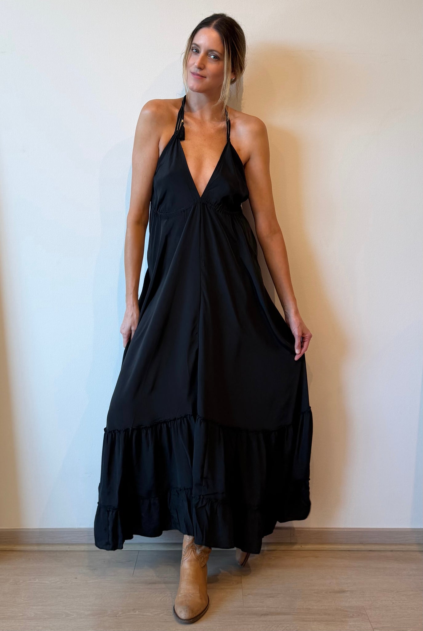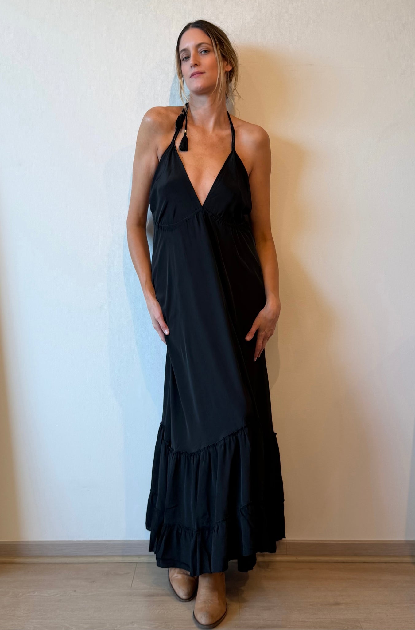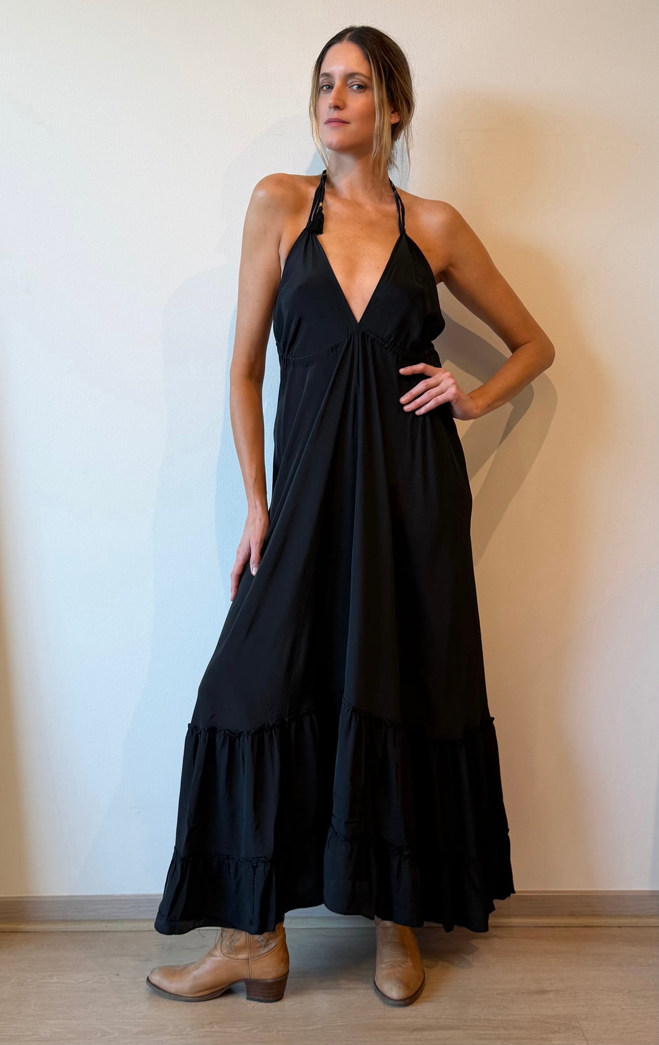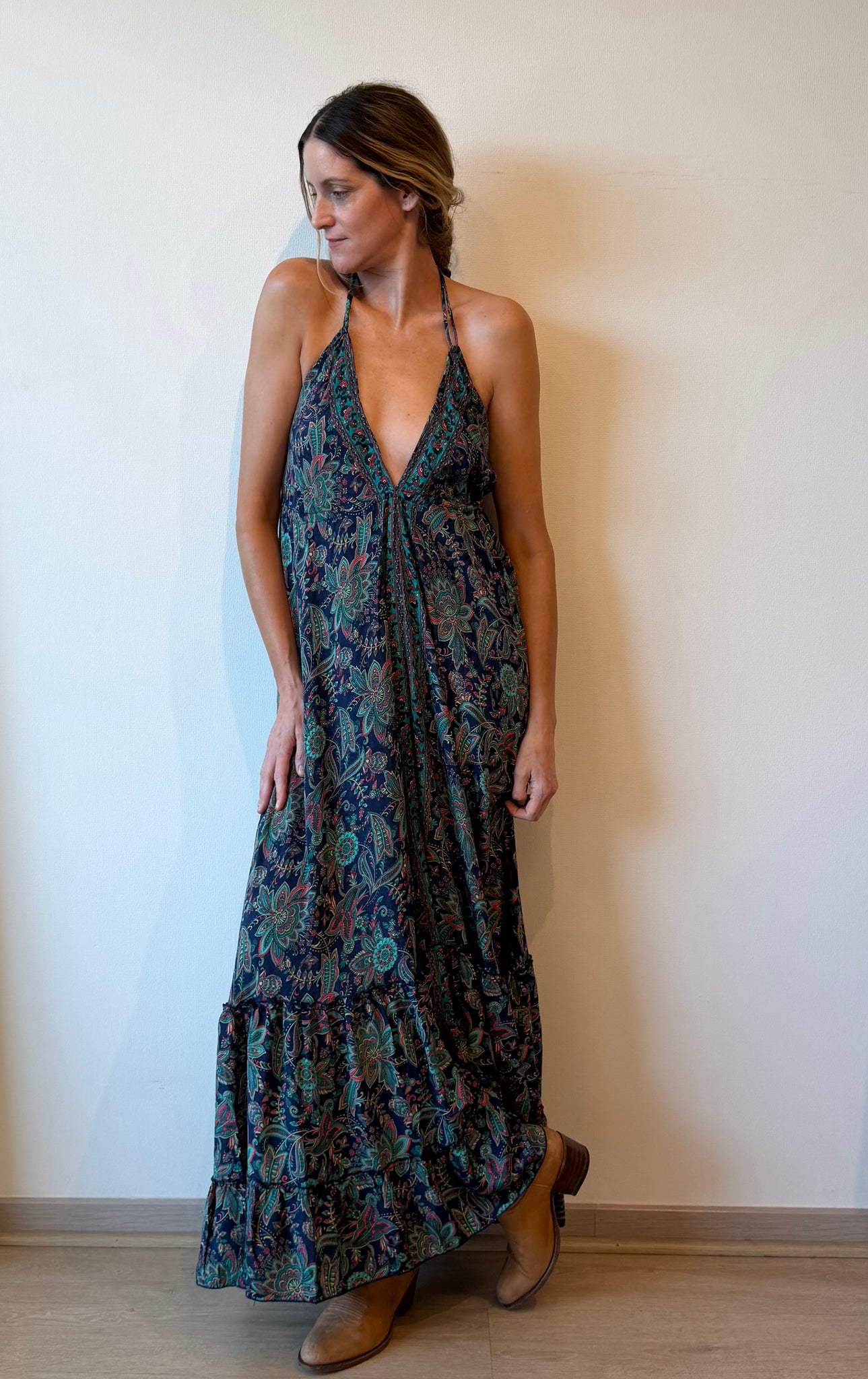 Vestido largo de seda estampado. Se amarra al cuello, tiene la espalda descubierta y se ajusta con los tirantes. Tiene muy lindo ruedo. Talla única.