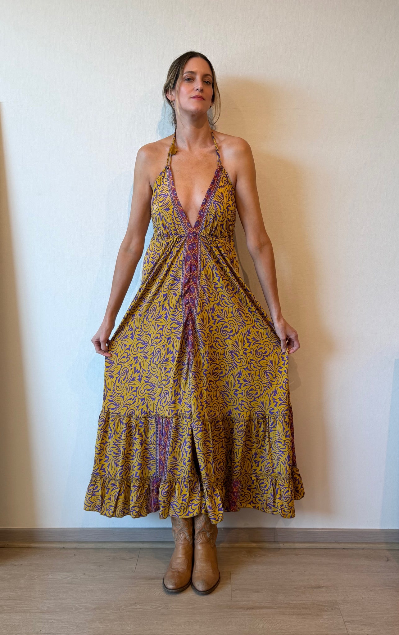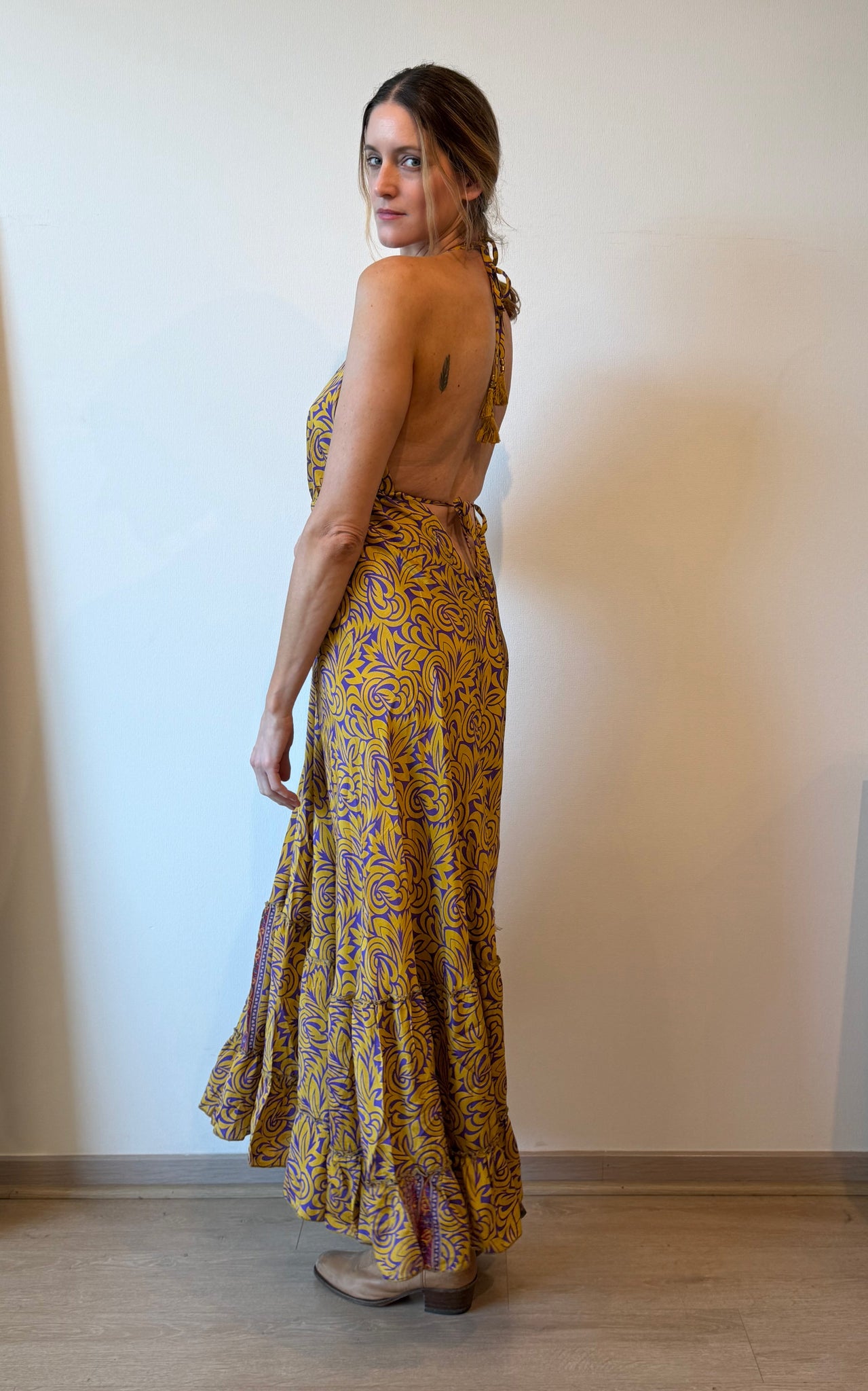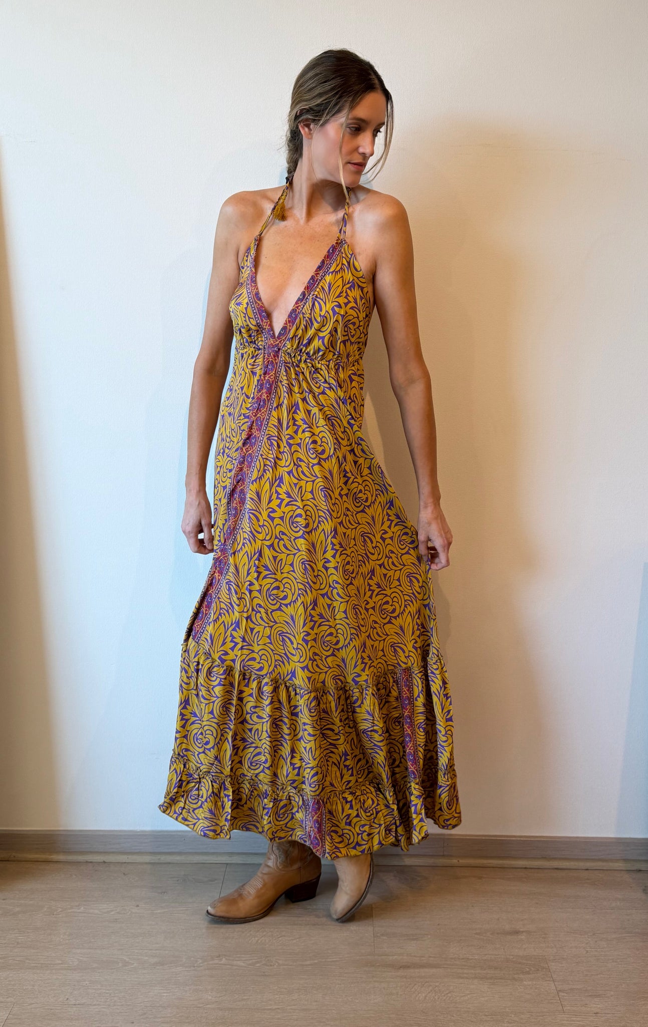 Vestido largo de seda estampado. Se amarra al cuello, tiene la espalda descubierta y se ajusta con los tirantes. Tiene muy lindo ruedo. Talla única.
