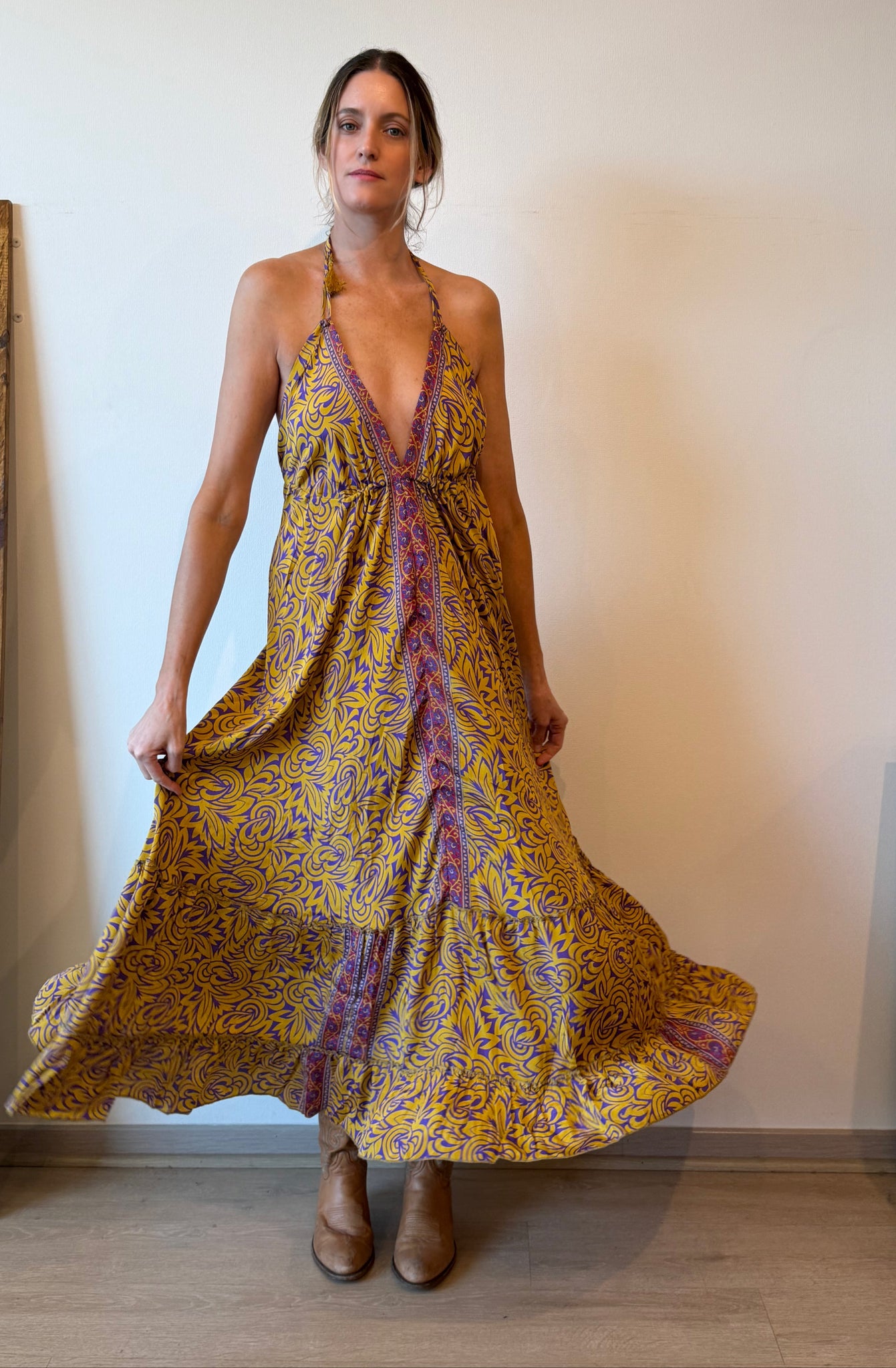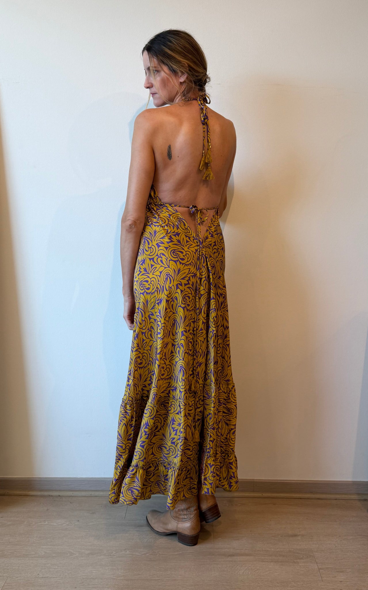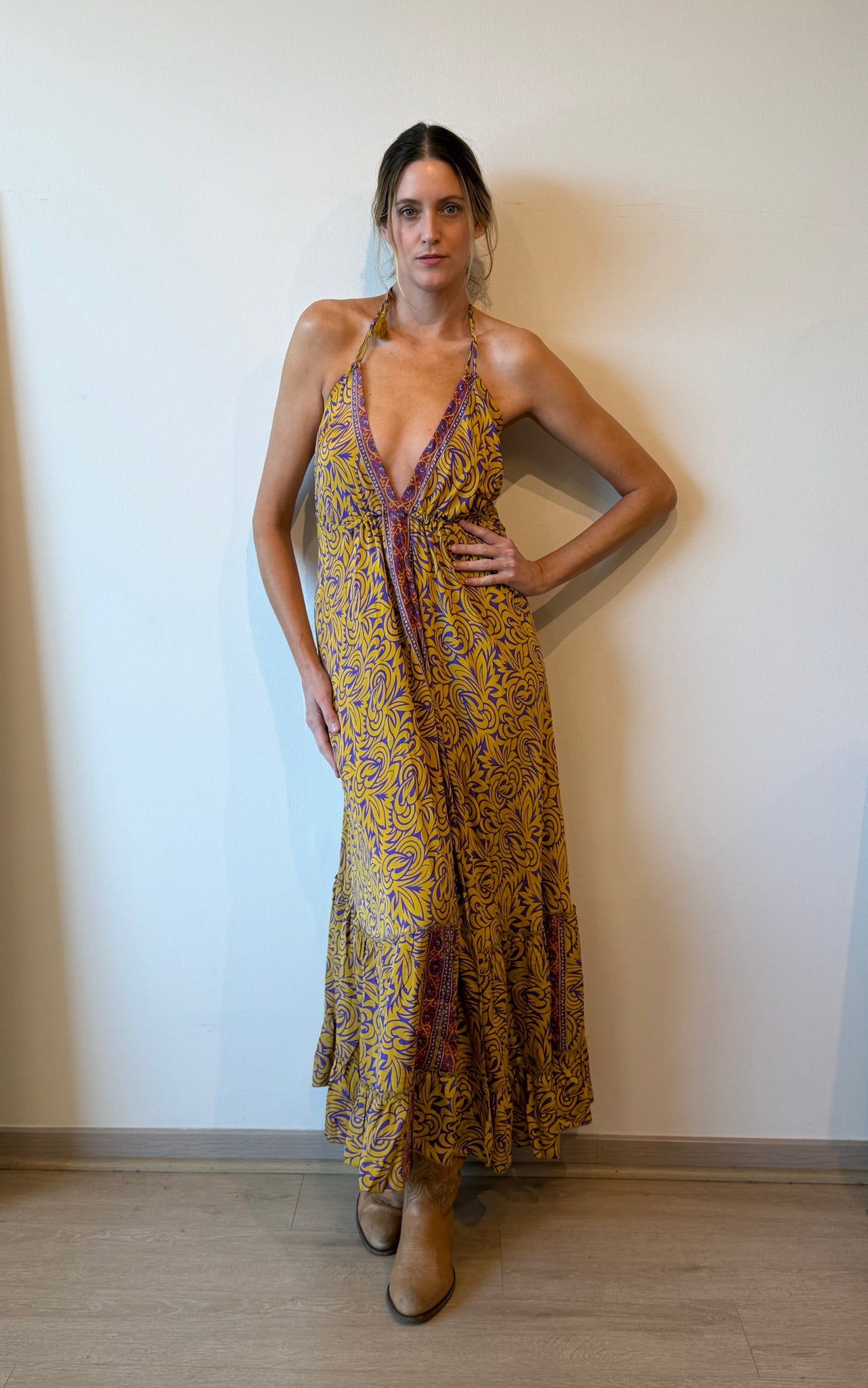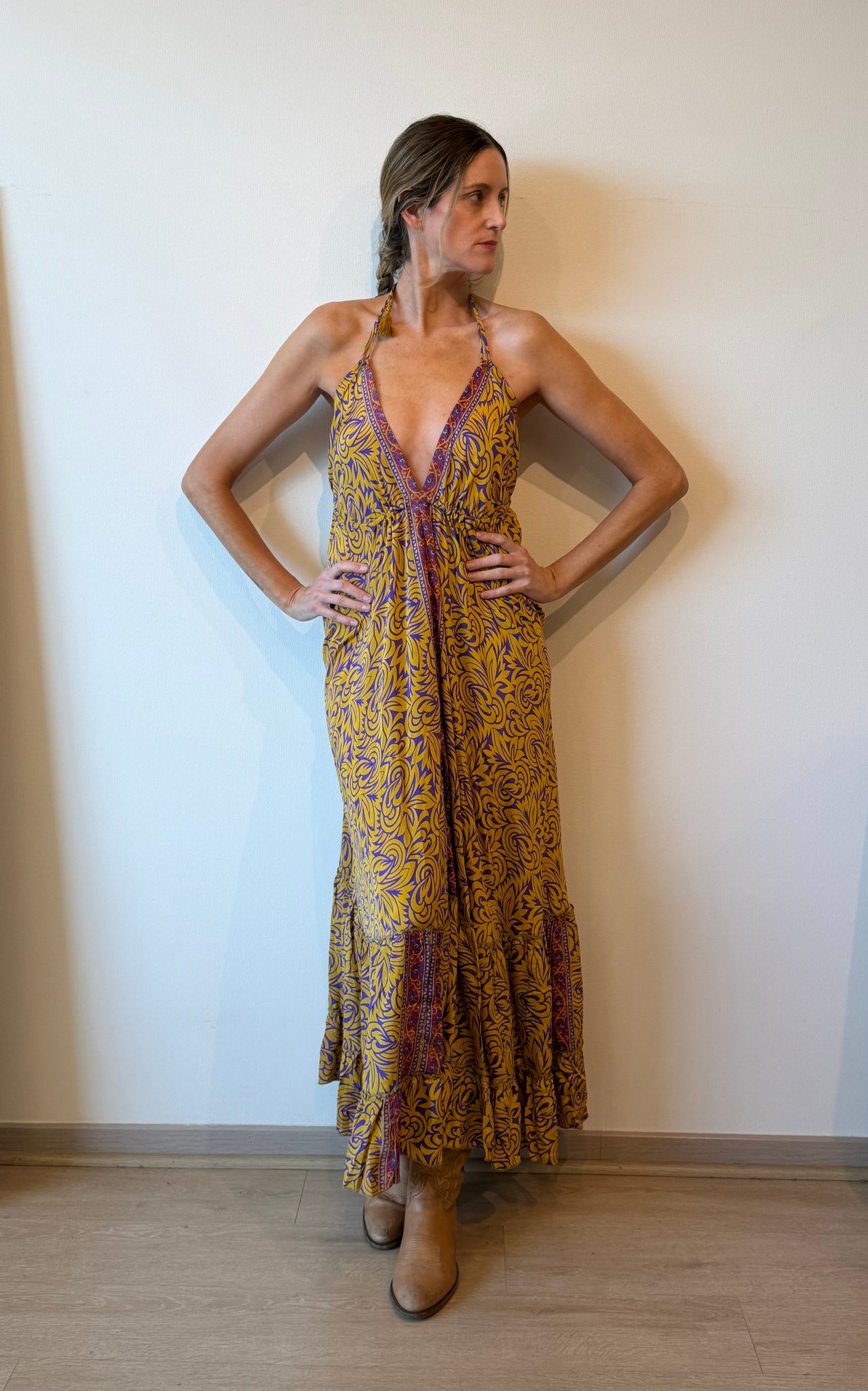 Vestido largo de seda estampado. Se amarra al cuello, tiene la espalda descubierta y se ajusta con los tirantes. Tiene muy lindo ruedo. Talla única.