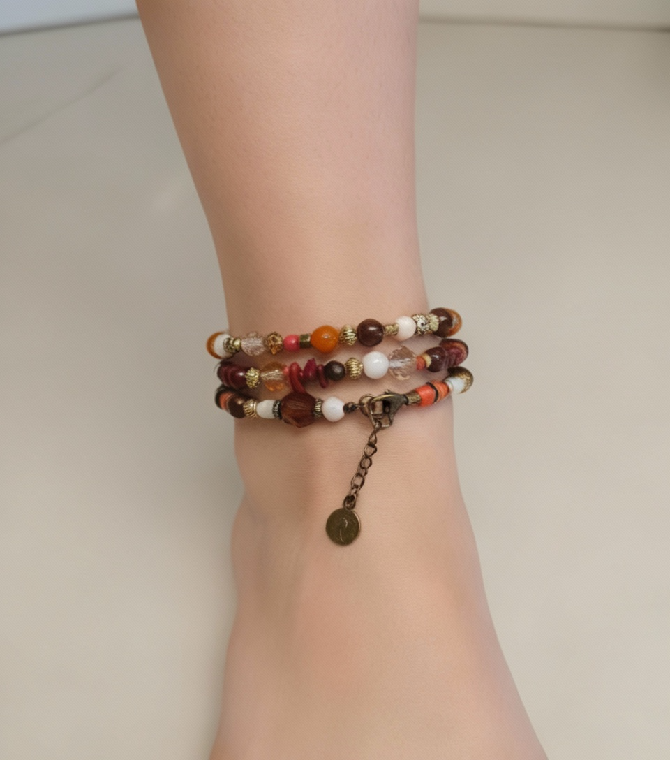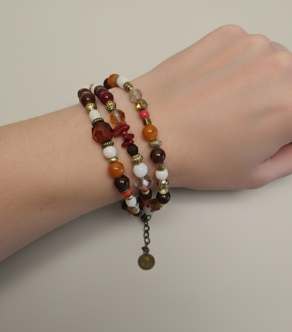 Pulsera artesanal en colores naranjos, marrón, rojo y blanco, con toques dorados, aportan un estilo único. Tiene una moneda colgante de la reina Elizabeth.