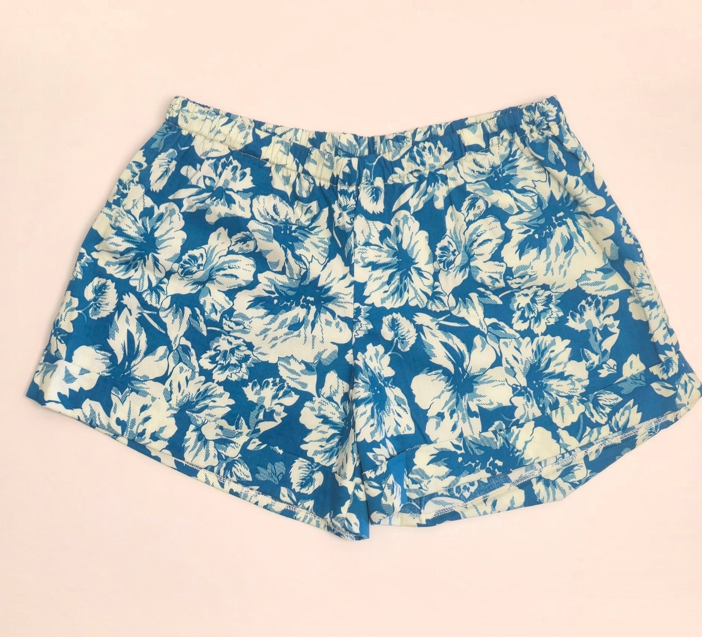 Short de algodón estampado flores tonos celeste y blanco, ideal para el verano. Tiene bolsillos y una pretina elasticada.